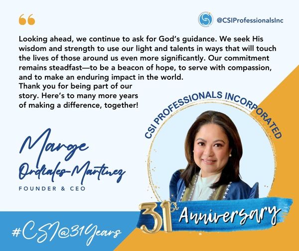 Celebrating 31 Years of Making a Difference! As we mark both the 31st anniversary of CSI Professionals and the birthday of our incredible founder and CEO, Ms. Marge Ordiales-Martinez, we are reminded of the powerful mission that drives us every day. Through dedication, compassion, and service, CSI continues to transform lives and provide hope and opportunity for so many.